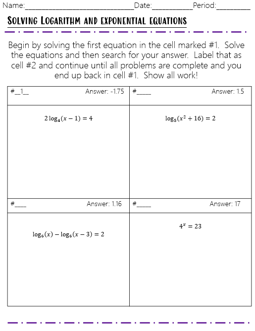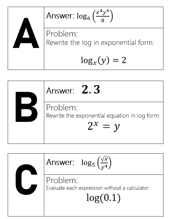 This is the most comparable activity to a worksheet. It is also the sitting down version of the “around the room version B”. You place your questions in the boxes and the answer to that question on one of the other questions. This should lead the students on a “circuit” through all of the questions. If they do all of them correctly, they should end up at the first problem they started with.