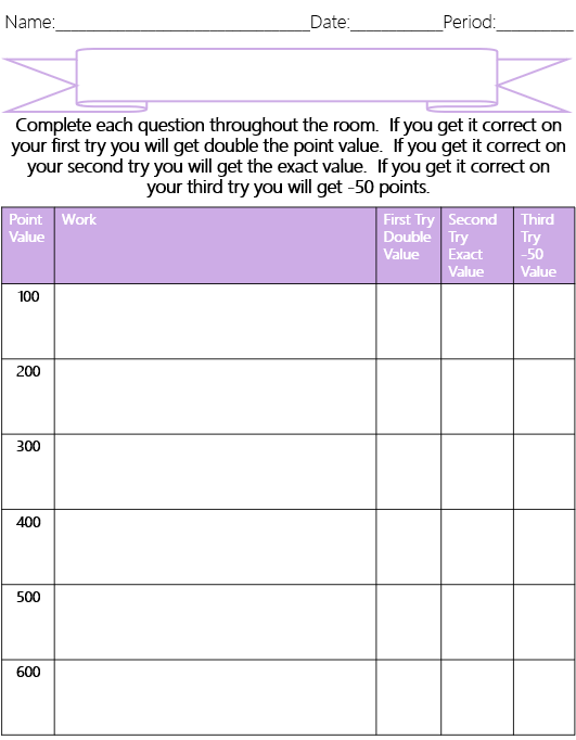 Version B: Student version is always ready to go, type 10 questions into the “points” boxes from easiest to most difficult, cut and paste around the room. Give each student a student page and then students can work at their own pace. They can check in with you after every problem, every few, or wait until the very end. If they get it correct on the first try – double points, second try, exact points, and last try is minus 50.