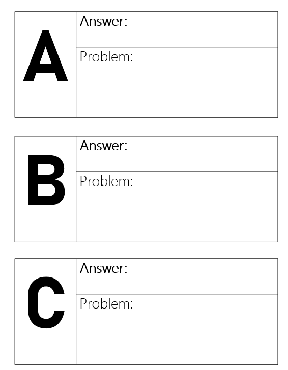 Version A: Type your questions into the letter boxes, and then put the answers to the question on the next letter. Cut and hang the letters around the room. Students can start wherever and if everything is done correctly, their flow should bring them back to the letter that they started at.