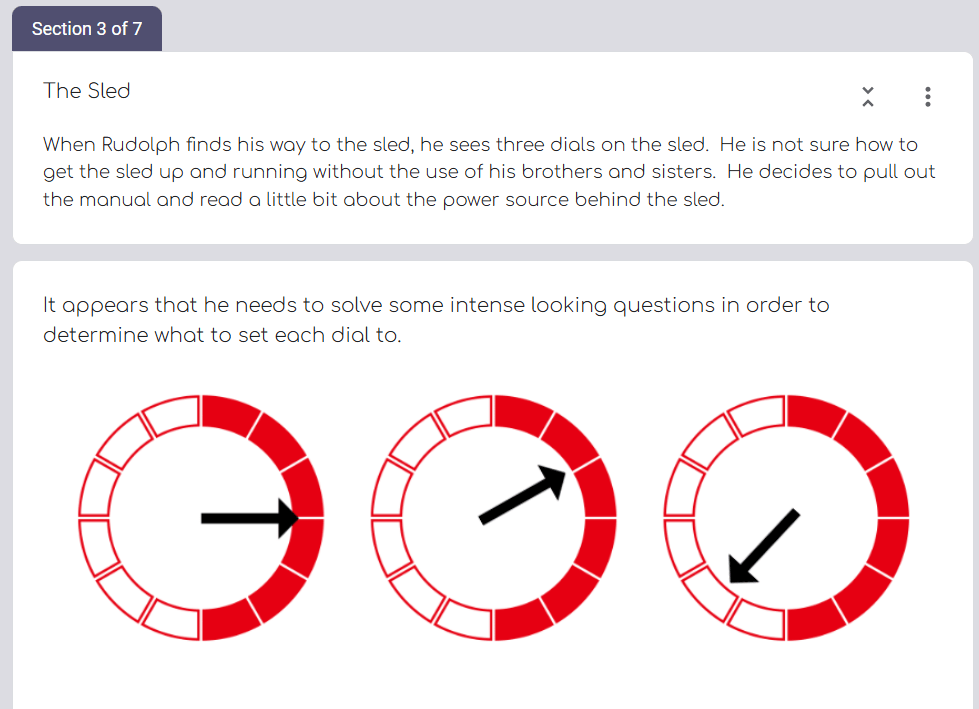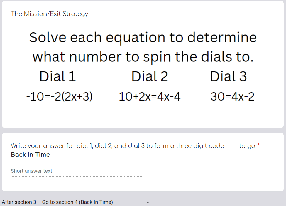 This is the hardest activity to have a template for – but creating this activity goes pretty quick. You will need to use google forms in order to create an escape room because it allows you to lock the next section until a code is put in. On each page of the google form, put another question, mark it as required, and then add a code to get to the next section. At the very end of the question I put a picture that they need to upload for the assignment so that I know they made it all the way through and did it correctly. There is usually a theme such as helping santa save christmas, or help jack-o’-lantern deliver all of the candy.