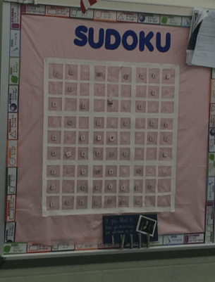 In my first couple of years I wasn’t really sure how I wanted to do boards. I think that I initially had thought I would be changing it every couple of months. Over time, I learned that was something I could not keep up with nor did I want to keep up with. I initially had a board up that was the current unit’s outcomes, goals, and assignments. Then every unit I would print out the next unit, laminate them, and put them up. I bet the students DID NOT EVEN LOOK AT IT. As you can see below, I eventually gave up on that and started to hang up the student’s artwork. The Sudoku board was cool (and interactive) but the pieces kept falling apart and again, I would have to update it every week with a new Sudoku setup. This is just not sustainable for a teacher.